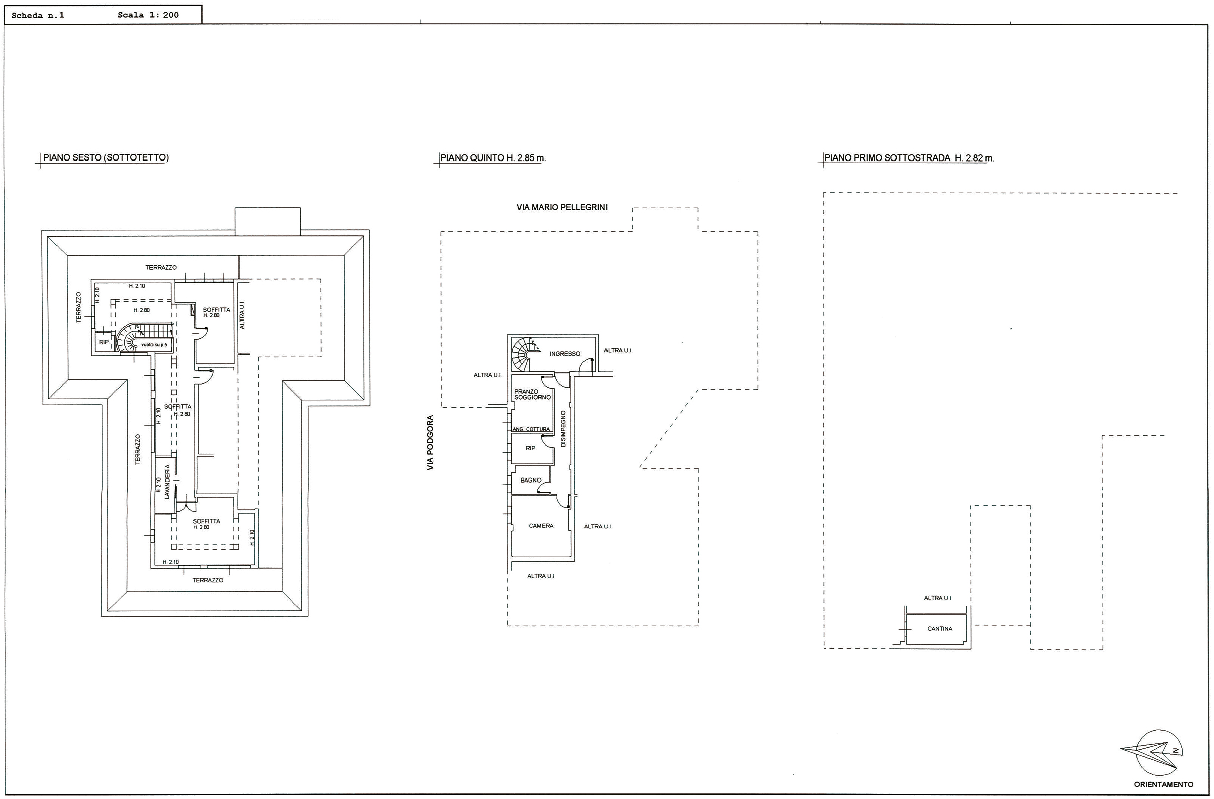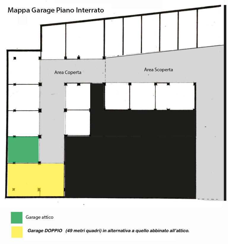 “L’attico è dotato di garage, (verde nella planimetria qua a fianco) ma ci sono alternative, si può prendere solo quello più grande (giallo nella planimetria) con un’aggiunta. di 15.000 €, se si acquistano entrambi il prezzo del secondo (giallo) è di 25.000 € .